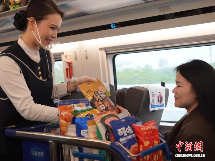餐饮服务员在车厢为旅客提供零食、饮品服务。 李维莉 摄